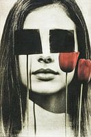 Een uniek en intrigerend kunstwerk dat een portret combineert met surrealistische elementen. Het zwart-witteffect geeft een tijdloze uitstraling, terwijl de toevoeging van rode tulpen een opvallend kleurcontrast biedt. Perfect als eyecatcher in moderne interieurs of als gespreksstarter in een kantooromgeving.