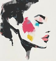 expressief portret van een vrouw in profiel, uitgevoerd met losse en dynamische penseelstreken. De stijl is minimalistisch, maar krachtig door het gebruik van contrasterende kleuren en gedurfde lijnen. Het gezicht van de vrouw is voornamelijk opgebouwd uit zwart, roze en rode accenten die haar lippen en ogen benadrukken, terwijl subtiele turquoise en gele vlakken levendigheid aan het werk toevoegen. De losse penseelstreken geven het portret een spontane, bijna impressionistische uitstraling, terwijl de gedurfde lijnen haar gelaatstrekken accentueren en haar een sterke en zelfverzekerde uitstraling geven.