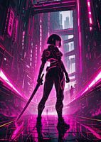 Vrouwelijke Cyberpunk Krijger met Neon Stadsgezicht Cyberpunk
