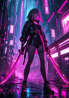 Vrouwelijke Cyberpunk Krijger met Neon Stadsgezicht Cyberpunk