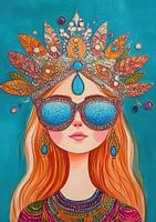 Vrouwelijke Schoonheid - Op dit kleurrijke vrouwenportret schilderij zie je een vrolijke jonge vrouw met grote, gedetailleerde zonnebrillen en een rijk versierde kroon, tegen een levendige turquoise achtergrond.