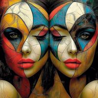 Symmetrisch portret van twee identieke vrouwelijke gezichten, die naast elkaar zijn geplaatst en één beeld lijken te vormen. De gezichten zijn opgesplitst door een veelvoud aan kleurrijke, geometrische patronen die doen denken aan glas-in-lood of een gebarsten spiegel. De levendige kleuren — blauw, rood, geel en zwart — zijn krachtig tegen de huidtinten van de gezichten geplaatst, en de scherpe lijnen van het patroon contrasteren met de zachte rondingen van de gelaatstrekken.