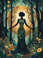 Dit kunstwerk combineert elementen van art nouveau en symbolisme, waarbij de sierlijke lijnen en decoratieve patronen van de art nouveau-beweging duidelijk zichtbaar zijn in de weelderige details van de jurk en de achtergrond. De silhouet van de vrouw wordt omringd door een magisch bos, waar het licht door de bomen heen schijnt en een…