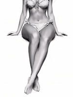 Deze afbeelding toont een gestileerde weergave van het vrouwenlichaam in bikini, met de nadruk op de heupen, benen en voeten. Het monochrome kleurenschema in verschillende grijstinten geeft het beeld een tijdloze en klassieke esthetiek, die doet denken aan potloodtekeningen of oude foto's. De vrouw zit op een onzichtbaar oppervlak, haar…