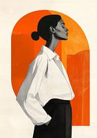 Een minimalistische lijntekening collage toont een vrouw in een stijlvolle, modebewuste pose, gekleed in een witte blouse. De achtergrond is gevuld met levendige oranje kleuren die haar elegante uitstraling versterken. Strakke lijnen en eenvoudige, verfijnde vormen worden gebruikt om de aandacht te vestigen op de pure esthetiek van de compositie. De combinatie van minimalisme en mode creëert een moderne, chique sfeer waarin elke lijn en kleur zorgvuldig is gekozen om een gevoel van balans en verfijning uit te stralen.
