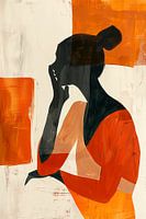 De vrouw lijkt diep in gedachten verzonken, met haar hand tegen haar gezicht, wat een sfeer van introspectie en contemplatie creëert. Het gebruik van warme oranje en rode tinten contrasteert…
