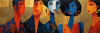 Vrouwen Goud | Blue Elegance - Dit moderne schilderij toont vrouwen met opvallende gezichten in levendige kleuren, waarbij een levendige blauwe tint een krachtig contrast vormt met warme oranje en rode tinten, allemaal omgeven door een gouden achtergrond die het geheel een luxe uitstraling geeft.