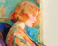 Vrouwen Portret - Dit vrouwen schilderij toont een zijprofiel van een jonge vrouw met elegant vloeiend rood haar en een kleurrijk gestreepte blouse, uitgevoerd in een levendige, impressionistische stijl.