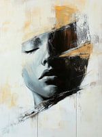 Vrouwen Rust - Dit vrouwen schilderij toont een vrouwelijk gezicht in serene rust, artistiek gespleten door abstracte, dynamische penseelstreken in zwart en beige.