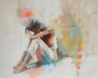 Vrouwen Schilderij Abstract - Dit vrouwen schilderij toont een vrouwelijk figuur in een introspectieve pose. Zittend met haar hoofd naar beneden en haar armen om haar benen geslagen, straalt de pose een diep gevoel van reflectie of somberheid uit. De vrouw is geplaatst tegen een achtergrond van abstracte, vloeiende kleuren en vormen die…