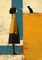 Vrouwen Schilderij | Contemplative Encounter - Dit vrouwen schilderij toont een vrouw en een raaf tegen een achtergrond van contrasterende kleurvlakken in blauw en geel, wat het gevoel van contemplatie en stilstand versterkt in een modern minimalistische stijl.