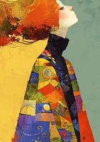 Vrouwen Schilderij | Patchwork Poise - Dit kleurrijke vrouwen schilderij toont een profiel van een vrouw met een keurig fragmentarisch, patchworkachtig jasje in een scala van levendige kleuren, afgewisseld met historische en abstracte patronen, die contrasteren met de zachtheid van haar huidtint.