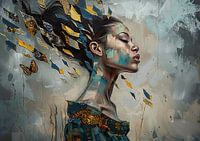 Vrouwen Schilderij | Serene Beauty Unfolding - Dit vrouwen schilderij toont een portret van een jonge vrouw met gesloten ogen in een serene pose. Haar hoofd is lichtjes naar rechts gekanteld, en haar gezicht is levendig en gedetailleerd weergegeven. De meest opvallende elementen zijn de fragmenten en gouden bladeren die uit haar haar lijken te komen, wat een dynamisch en bijna magisch effect geeft. Deze bladeren verspreiden zich rond haar hoofd als een aura of corona en voegen een element van beweging en levendigheid toe aan het schilderij. De achtergrond is abstract, met penseelstreken en watervlekken in grijstinten en blauwe kleuren die een rustieke en ongestructureerde sfeer creëren. Dit zorgt voor een sterk contrast met de verfijnde en bijna etherische afbeelding van de vrouw. Haar kleding is gedetailleerd en kleurrijk met motieven die doen denken aan traditionele kunst, wat diepte en culturele context aan het werk toevoegt.