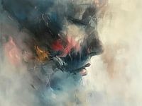 Vrouwen Schilderij | Whispering Colours - Dit abstracte gezichtsschilderij presenteert een krachtige en emotionele uitdrukking van een vrouwenportret, vervloeid binnen een wervelwind van kleuren en textuur. Het gezicht is slechts gedeeltelijk en diffuus vertegenwoordigd, voornamelijk gefocust op de rechterzijde. De ogen zijn niet…
