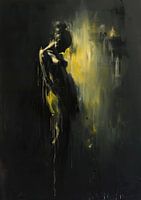 Vrouwen Schilderij Zwart - Dit vrouwen schilderij toont de kwetsbare en subtiele afbeelding van een vrouw, verhuld in duisternis en mysterie. De vrouw bevindt zich centraal op het doek, haar contour vervaagd en overgaand in de donkere, abstracte achtergrond. Haar hoofd is licht naar beneden gebogen in een beschouwende of droevige houding, waardoor een gevoel van melancholie of reflectie wordt opgeroepen. Het gebruik van zwart, grijs, en diepe schaduwen domineren het schilderij, terwijl plotselinge strepen en spatten van helder geel en wit tegen deze donkere achtergrond een sterk contrast vormen en de aandacht trekken naar haar figuur en gemoedstoestand. Dit expressionistische vrouwen schilderij gebruikt dikke, dynamische penseelstreken, die textuur en beweging toevoegen, terwijl druppels en strepen verf lijken te 'druppelen' langs het canvas, wat een gevoel van tranen of regen suggereert.