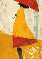 Vrouwen Schilderij - Dit vrouwen schilderij met krachtige oranje en geelachtige tinten toont een vrouw van achteren met een grote rode paraplu tegen een sereen bloemenveld.