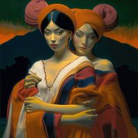 De vrouwen in deze portretten stralen een mysterieuze schoonheid uit, gekleed in rijke, gedetailleerde stoffen die doen denken aan de gouden accenten en decoratieve elementen van Klimt. Hun huid glanst als satijn en hun gezichten zijn vol leven en emotie.
