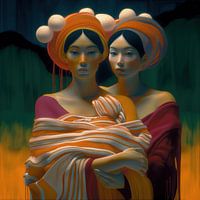 De vrouwen in deze portretten stralen een mysterieuze schoonheid uit, gekleed in rijke, gedetailleerde stoffen die doen denken aan de gouden accenten en decoratieve elementen van Klimt. Hun huid glanst als satijn en hun gezichten zijn vol leven en emotie.