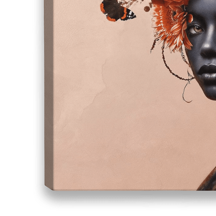 Hier zie je een krachtig portret waarin mens en natuur samenkomen. Het gezicht is rustig, bijna sculpturaal, en omringd door een kroon van bloemen: rode rozen, een volle witte dahlia, oranje en gele accenten. Tussen de bloemen zitten kleine vlinders verstopt, alsof ze daar thuishoren. Als je beter kijkt, zie je dat de huid zelf ook…