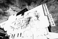 Zwart wit foto van een muur in de Straat van Maleisie, George Town, Penang street art. Een muurschildering van een vrouw met haar ogen dicht en haar haren als de takken van een boom waar vogels in genesteld zijn. De straatkunst is op een witte muur geschilderd.