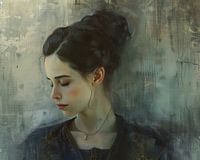 Vrouwen - Dit vrouwen schilderij toont een jonge vrouw met een serene en contemplatieve uitdrukking. Haar gezicht is zacht en gedetailleerd met een subtiele roze blos op haar wangen en een vredige blik die naar beneden gericht is. Haar donkerbruine haren zijn opgestoken in een elegante knot, enkele losse lokken sieren haar gezicht. De kleding van de vrouw is donkerblauw met delicate gouden borduursels die complexe, astrologische patronen vormen. De achtergrond van het schilderij is een mengeling van koele grijze en blauwe tinten, met abstracte vegen en krassen die een gevoel van diepte en textuur geven.