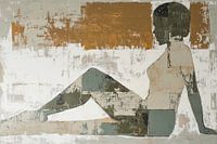 Vrouwenfiguur | Minimalist Back View - Dit vrouwen schilderij toont een gestileerde vrouwelijke figuur, zittend met haar rug naar de kijker, in een abstracte weergave met aardetinten en minimalistische trekken.