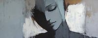 Vrouwenfiguur | Silent Grace Canvas - Dit vrouwen schilderij toont een gestileerde vrouwelijke figuur met gesloten ogen en subtiele gelaatstrekken, uitgevoerd in monochrome en neutrale tinten met accenten van zwart en bruin tegen een textuurrijke achtergrond.