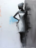 Vrouwenfiguur | Solitude Stroke - Dit moderne vrouwen schilderij toont een gestileerde vrouwelijke figuur in een minimalistisch witte jurk, subtiel geaccentueerd door oranje en blauwe spatten, tegen een jeing contrastrijk zwart-wit achtergrond.