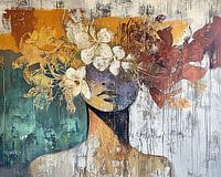 Vrouwenfiguur - Dit moderne portret schilderij toont een vrouwenfiguur met een dramatisch en kleurrijk bloemenhoofdtooi, overgoten met rijke aardetinten en texturen die een diepte en gevoeligheid uitstralen.