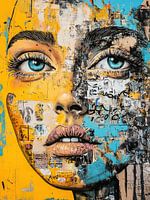 Vrouwengezicht | Eyes Through Urbanity - Dit vrouwen schilderij toont een opvallend contrast tussen een realistisch en expressief vrouwengezicht met accenten in geel en zwart, overlopen met graffiti-achtige, abstracte elementen.