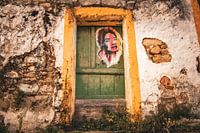 In het Sardijnse dorpje Orgosolo vind je op iedere muur en deur streetart, vaak van geweldige kwaliteit. Dit kleurrijke vrouwengezicht is op een verweerde deur getekend of gestencild. Of was het onderdeel van een grotere tekening?
