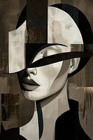 Vrouwengezicht - Dit abstracte portretschilderij toont een vrouwengezicht met uitgesproken geometrische partities in overwegend zwart, wit en bruintinten, met een diepe nadruk op structuren en schaduwen die het een bijna driedimensionale diepte geven.
