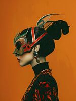Details: vrouw, masker, slang, surrealistisch, rood, zwart, oranje, futuristisch, eenzaamheid, mysterie