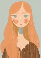 Vrouwenportret | Abstract Beauty in Pastel - Dit vrouwen schilderij toont een gestileerde vrouwelijke figuur met lang, vloeiend koperkleurig haar en opvallende, grote, blauwe en bruine abstracte wangen, uitgevoerd in zachte pasteltinten.