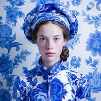 Haar kleding is gedetailleerd weergegeven in de typische blauwe en witte patronen die karakteristiek zijn voor Delfts aardewerk, en ze straalt een ingetogen elegantie uit.