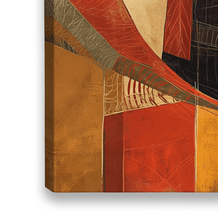 Vrouwenportret | Ethereal Grace - Dit vrouwen schilderij toont een elegant figuur in een lange rode jurk, die majestueus tegen een achtergrond van abstracte geometrische vormen en warme aardetinten staat.