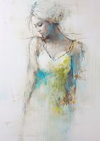 Vrouwenportret | Ethereal Grace - Dit vrouwen schilderij toont een serene dame met neergeslagen blik, gekleed in een vloeiende, levendig gekleurde jurk, uitgevoerd in abstract impressionistische stijl met losse, energieke penseelstreken en een subtiele kleurrijke achtergrond.