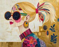 Vrouwenportret | Moderne Vrouw Goud - Dit vrouwen schilderij toont een stijlvolle, jonge vrouw met grote ronde zonnebrillen, versierd met een abstract sterrenpatroon en gouden oorbellen die passen bij haar kleurrijke, patroonrijke kleding tegen een goud- en crèmekleurige achtergrond.