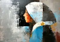 Vrouwenportret | Mystery in Color - Dit moderne vrouwen schilderij toont een zijprofiel van een vrouw met een abstracte, geschilderde sluier in levendige kleuren tegen een achtergrond van gestructureerde, grijze, zwarte en witte penseelstreken.
