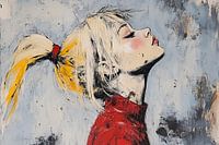 Vrouwenportret | Serene Elevation - Dit vrouwen schilderij toont een jonge vrouw met opgeheven gezicht en gesloten ogen, gekleed in een levendig rode trui, haar blonde haar strak gebonden in een hoge staart met een rode band, tegen een vaag, abstract blauw en grijs achtergrond, wat de schilderstijl van modern expressief realisme benadrukt.