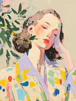 Vrouwenportret | Silent Color Symphony - Dit vrouwenportret schilderij toont een vrouw met gesloten ogen, haar gezicht deels verborgen achter levendige, abstracte kleurvlekken en enkele bladeren, uitgebeeld in een expressieve, bijna impressionistische stijl met dikke penseelstreken.