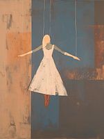 Vrouwenportret | Suspended Grace - Dit vrouwen schilderij illustreert een mysterieuze vrouw in een zwevende witte jurk, marionetachtig opgehangen tegen een achtergrond met een collage van industriële, roestige en blauw getinte vlakken.