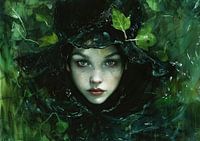 Vrouwenportret | Veiled Eyes, Leafy Shroud - Dit portret schilderij toont een jonge vrouw omgeven door een weelderige laag van groene bladeren, met waterdruppels die glinsteren alsof ze net uit een mysterieus, vochtig bos is gestapt.