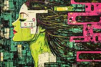 Vrouwenportret | Vivid Silence in Color - Dit vrouwen schilderij toont een portret van een vrouw in een abstracte, kleurrijke stijl met nadruk op levendige groene en roze tinten tegen een achtergrond van complexe geometrische patronen.