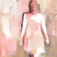 Vrouwenportret abstract in roze. Verschillende subtiele kleurtinten maken dit een interessant schilderij. Ondanks dat er niet veel verschillende kleuren gebruikt zijn, zit er toch veel contrast en diept in, waardoor het lijkt alsof de vrouw "uit het schilderij stapt".