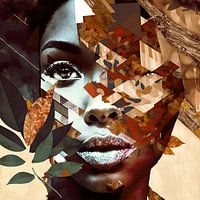 Een abstracte collage van het gezicht van een vrouw van kleur, gemixt met natuurlijke elementen als abstracte bloemen, planten en bladermotieven. Vierkant afdrukformaat.