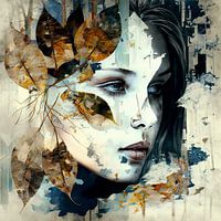 Deze abstracte kunst collage toont het gezicht van een vrouw in een gestileerde vorm, omringd door herfstbladeren. De bladeren vullen de achtergrond van de collage en omringen het gezicht van de vrouw, suggererend een verbinding met de natuur en het herfstseizoen. De kleuren van de bladeren zijn rijk en warm, met een gebruik van beige en crème als basis en accenten van oranje. De collage is expressief en intrigerend. De afmeting van de collage is een vierkant formaat, waardoor het krachtige beeld nog meer naar voren komt.