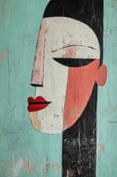 Deze abstracte illustratie toont een vrouwelijk zijprofiel in een gestileerde, geometrische stijl, geschilderd op een verweerde turquoise achtergrond. De grove textuur en zichtbare penseelstreken geven het werk een ambachtelijke, bijna houtachtige uitstraling. De contrasterende kleuren – rood, zwart, wit en zachtroze – versterken de expressieve lijnen van het gezicht. Dit kunstwerk combineert rustieke charme met moderne vormgeving en is perfect voor interieurs met een artistieke, vintage of bohemien sfeer.