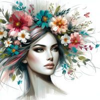 portret van een vrouw met kleurrijke zomerbloemen in haar haar, bloemenkapsel abstract