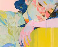 Vrouwenportret - Dit vrouwen schilderij toont een jonge vrouw rustend met haar hoofd en hand op een tafel, weergegeven in een expressieve, kleurrijke en abstracte stijl.